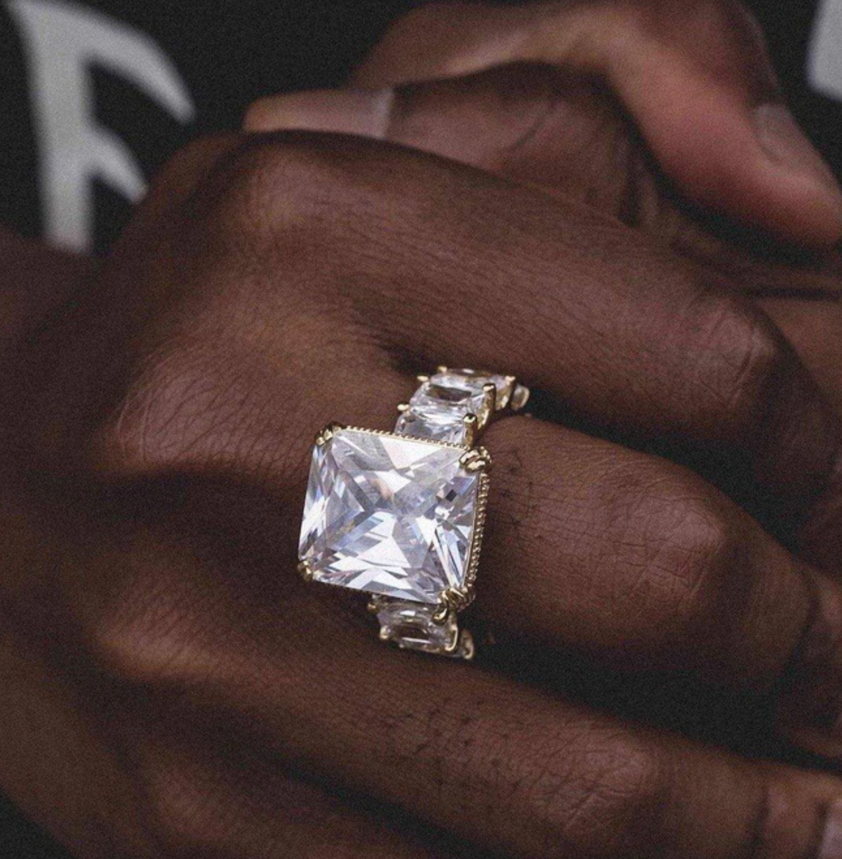 The Center Stone Baguette Band Ring is flooded in hand-set stones. Each individual stone around the band draws attention to its large center stone, giving it a bold look. This ring is made up of 100% precious metals made from 925 Silver covered in 3 microns of 18k Solid Gold.