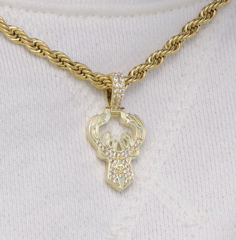 SHOPGOLD has teamed up with the NBA to introduce the official NBA Team Pendants. This piece was meticulously crafted with white and clear hand-set stones to accurately depict the iconic logo of the Milwaukee Bucks. Flex this NBA season with the official pendant of the Milwaukee Bucks.